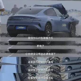 1、小米SU7的小电瓶设计在前机舱内,遇到视频中那样的激烈碰撞后会有小电瓶损坏造成多个应急功能无法使用的安全隐患。